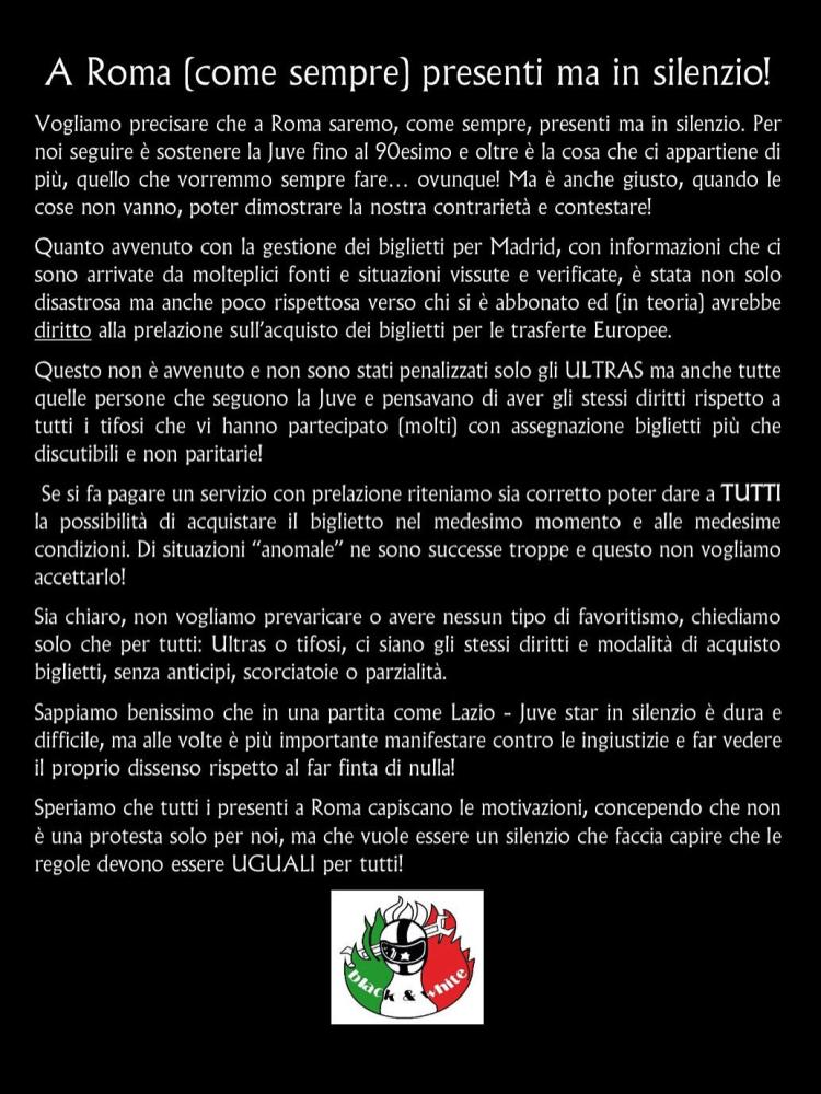 Nel comunicato si legge "ultras e tifosi abbiano le stesse modalità di acquisto, senza anticipi, scorciatoie o trattamenti parziali". Rimanere in silenzio per 90 minuti non sarà facile, soprattutto se la Juventus dovesse aver bisogno di supporto, ma, come riportano gli ultras bianconeri "è più importante manifestare contro le ingiustizie piuttosto che far finta di nulla". Per questo gli stessi chiedono a tutti i presenti comprensione in quanto non si tratta di una protesta solo per loro ma che è un modo per far capire che le regole devono essere uguali per tutti.