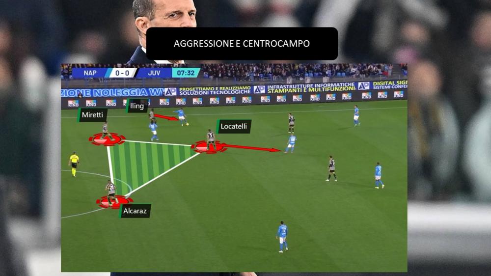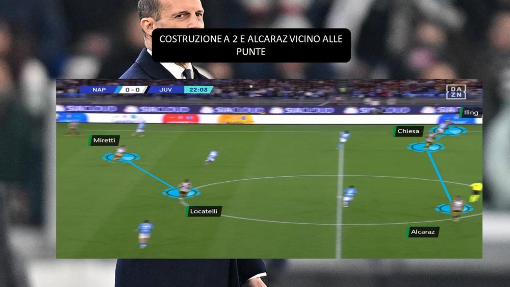 Mastica amaro la Juventus. I bianconeri non ingranano dopo la vittoria sofferta contro il Frosinone e subiscono la quarta sconfitta in campionato. Il Napoli batte la Vecchia Signora per 2-1 e prolunga il periodo un po' stentato di Madama in termini di risultati. Questa sconfitta, maturata al "Maradona", brucia tantissimo non solo per l'esito della sfida. Infatti, il passaggio a vuoto di Napoli arriva nonostante una buona prestazione. La nota positiva della gara sta soprattutto nel centrocampo. Massimiliano Allegri sceglie un reparto composto nel settore centrale da Fabio Miretti, Manuel Locatelli e Carlos Alcaraz. Il loro assortimento si dimostra funzionale sia in fase di possesso che in quella di non possesso, dando vita a due concetti lampanti soprattutto nella prima parte della sfida.